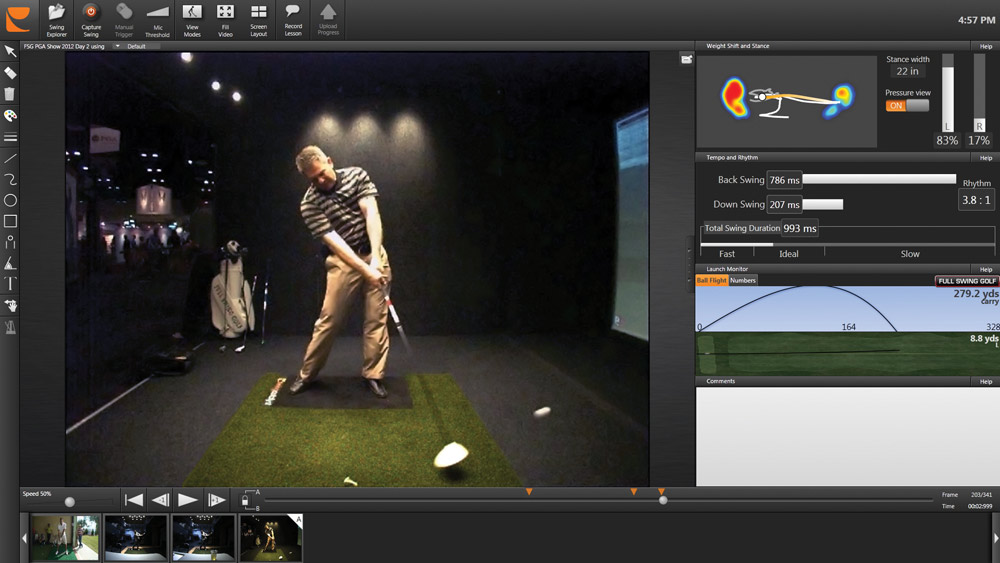 The Full Swing simulator, balance plate data, high definition video, and intuitive software tools are perfectly synchronized to